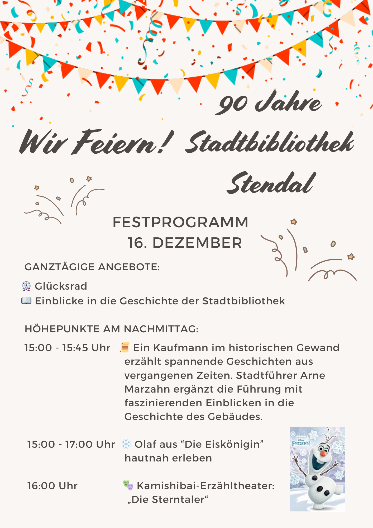 Am Dienstag, den 16. Dezember 2025, feiert die Stadtbibliothek Stendal ihr 90-jähriges Bestehen. Seit ihrer Gründung im Jahr 1935 ist sie ein zentraler Ort für Bildung, Kultur und Begegnung in der Hansestadt. Das Jubiläum wird mit einem bunten Programm für Groß und Klein begangen – ein ganzer Tag im Zeichen der Literatur und der lebendigen Geschichte der Bibliothek.